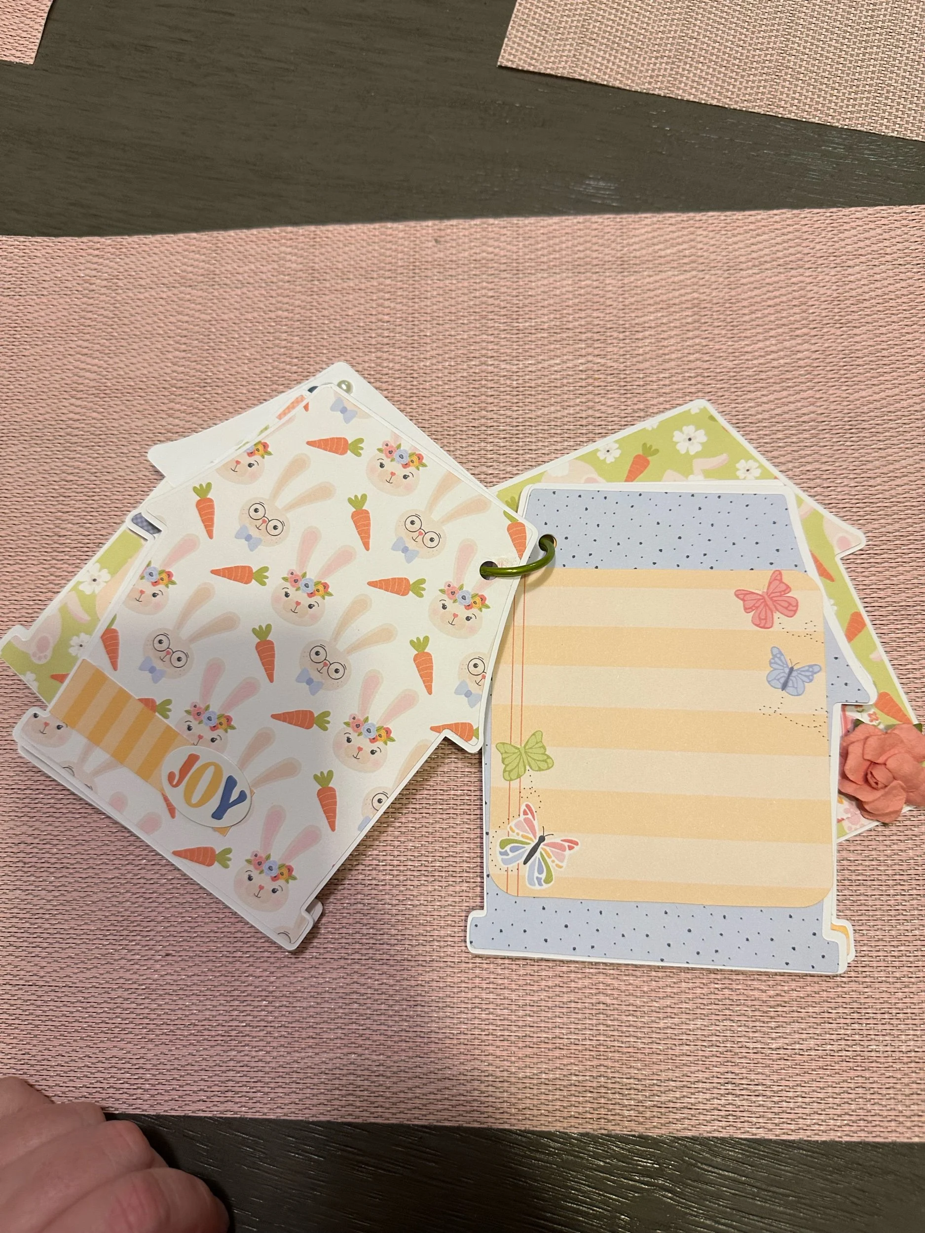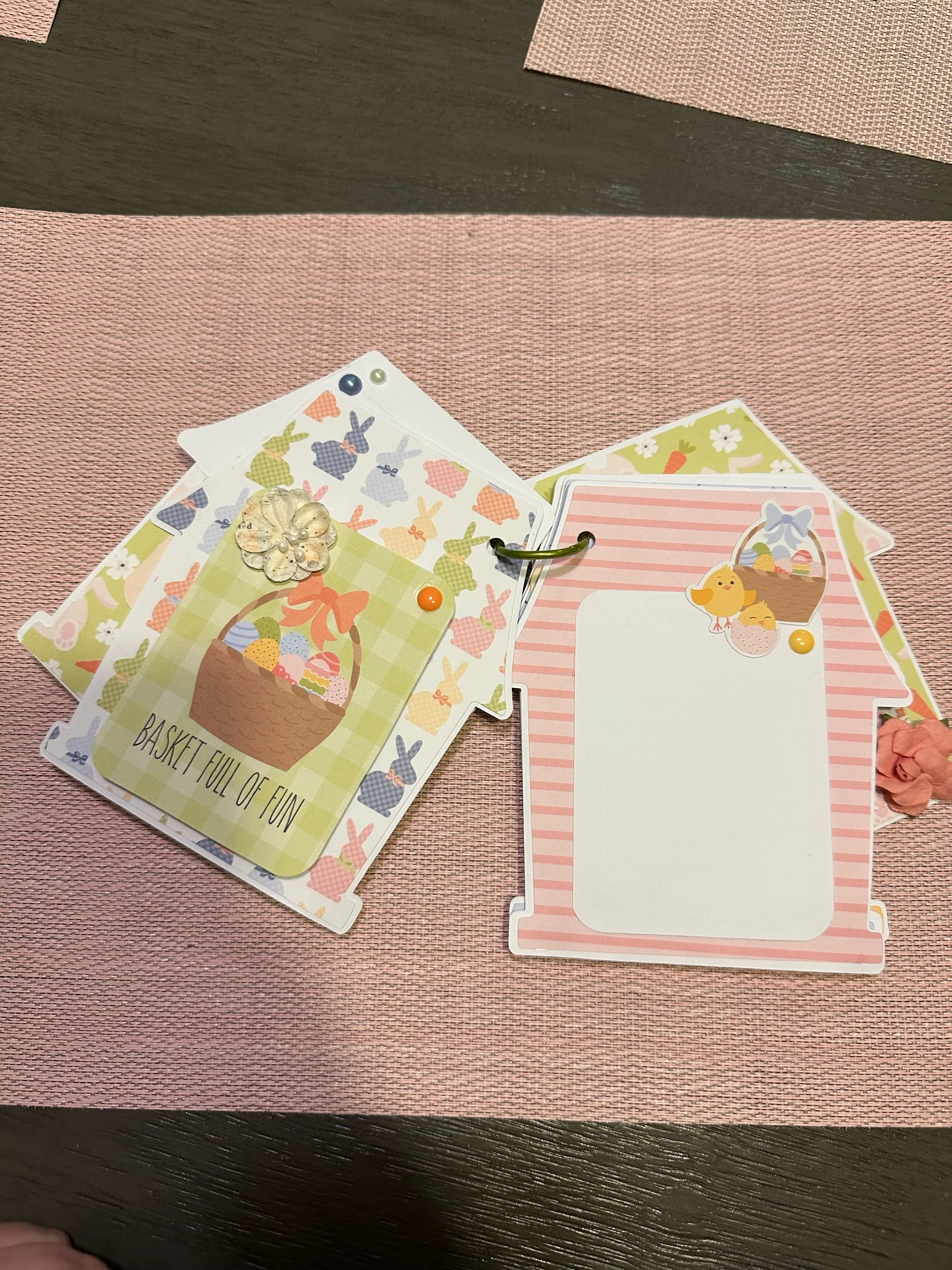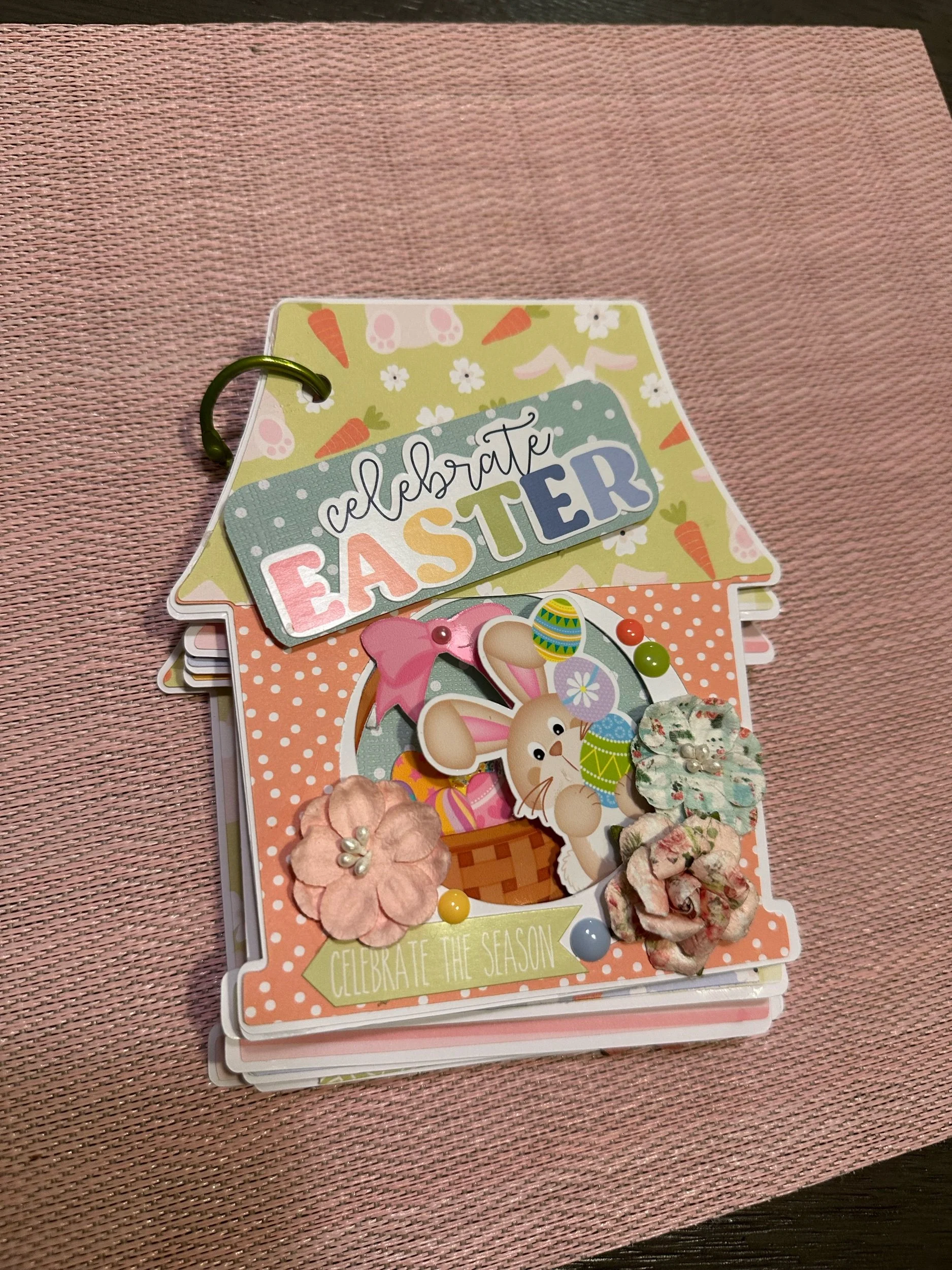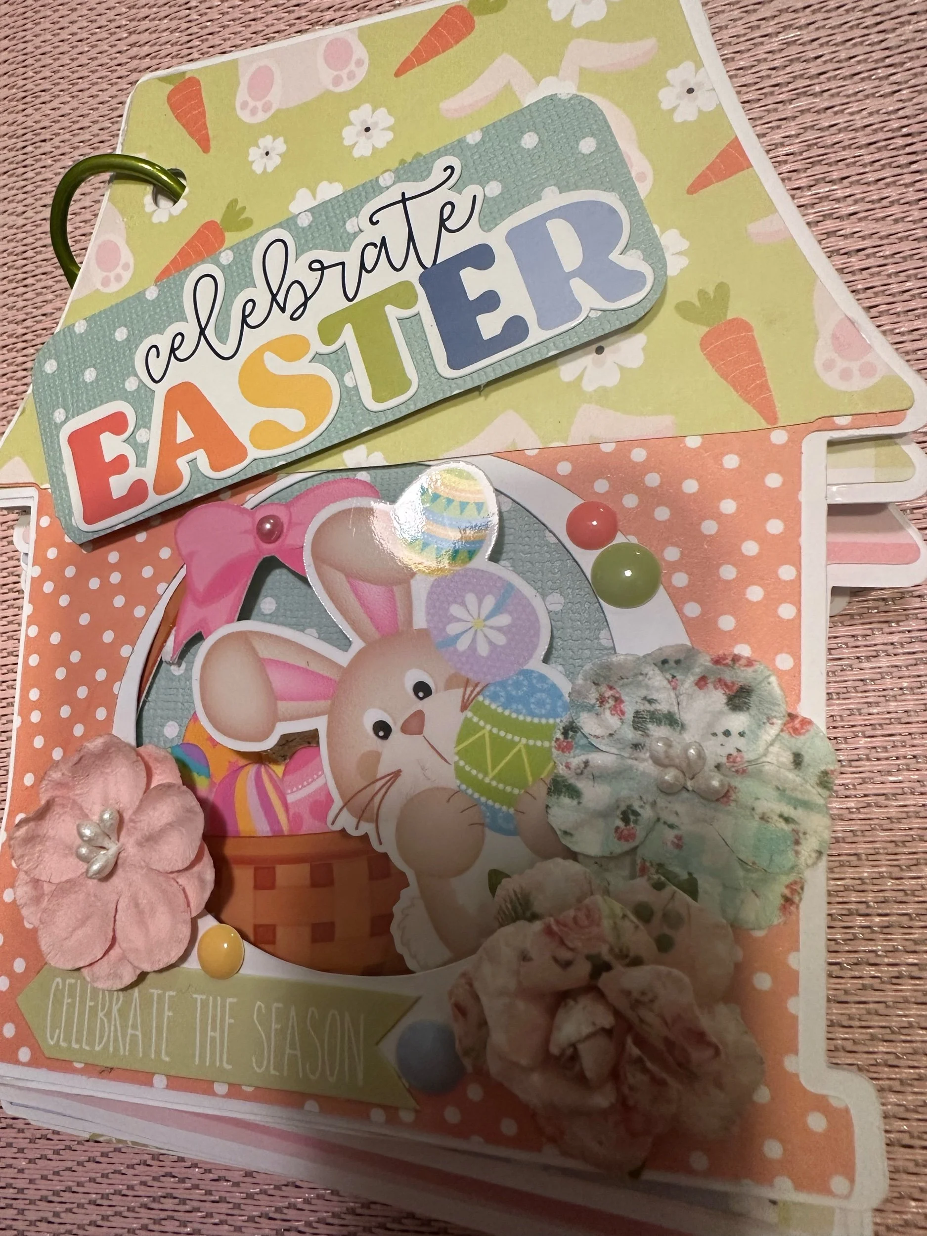 Easter themed memory book with places to add pictures, written text and a pocket in the back for additional items. Pages are connected with a binder clip.