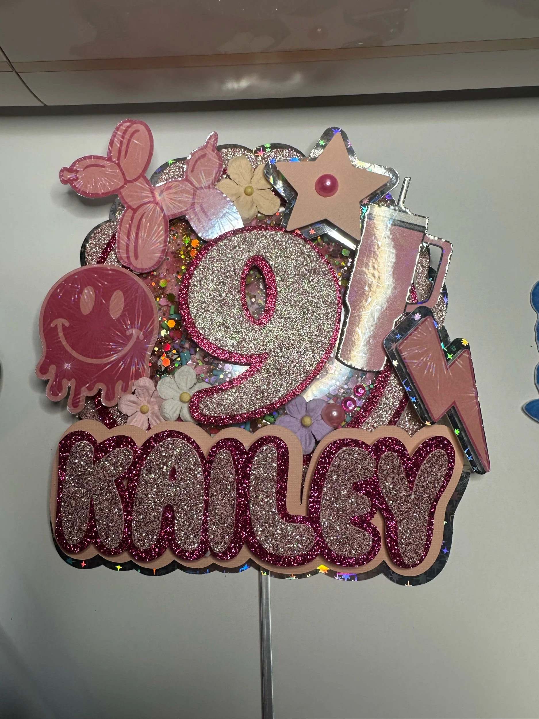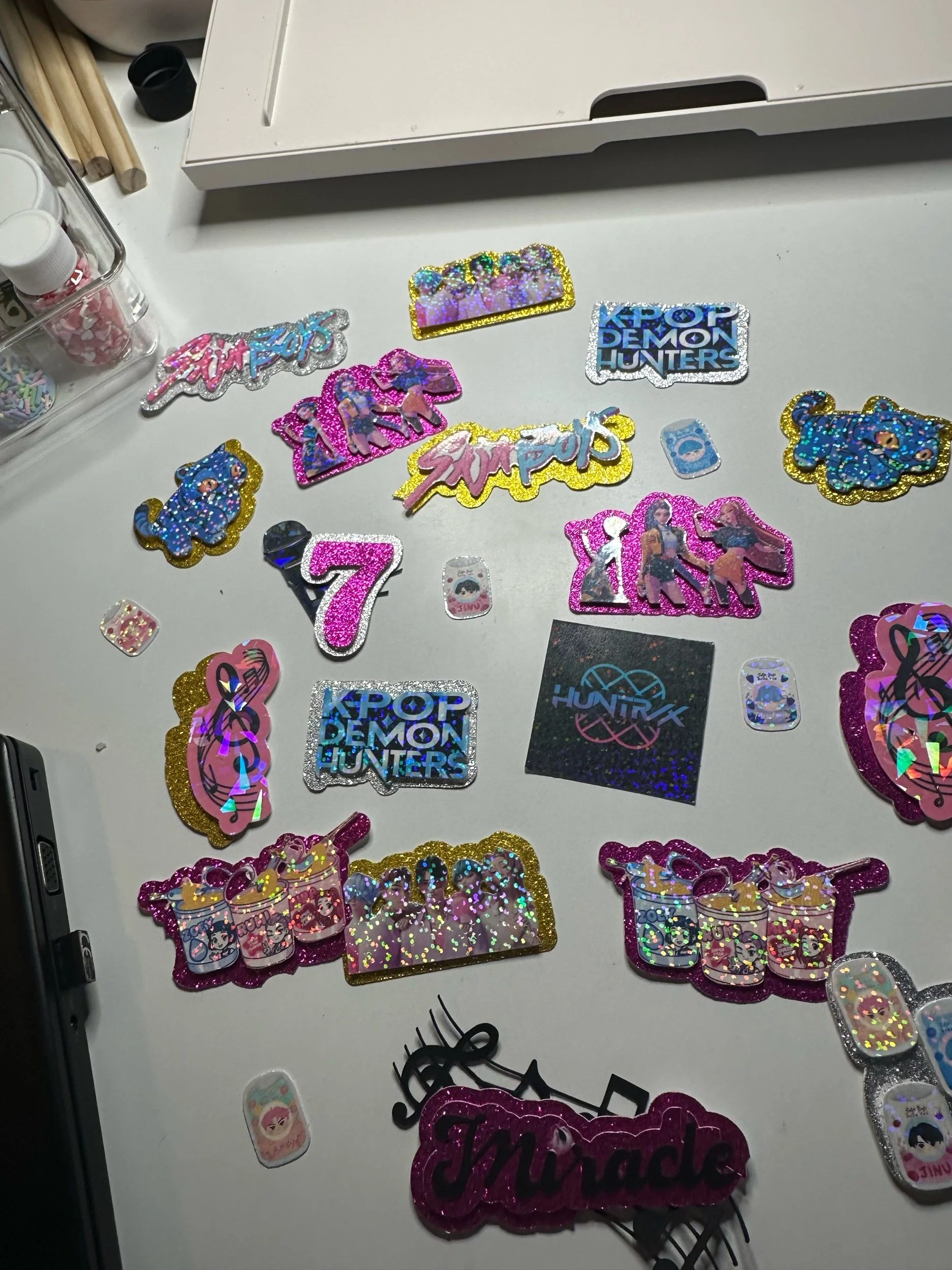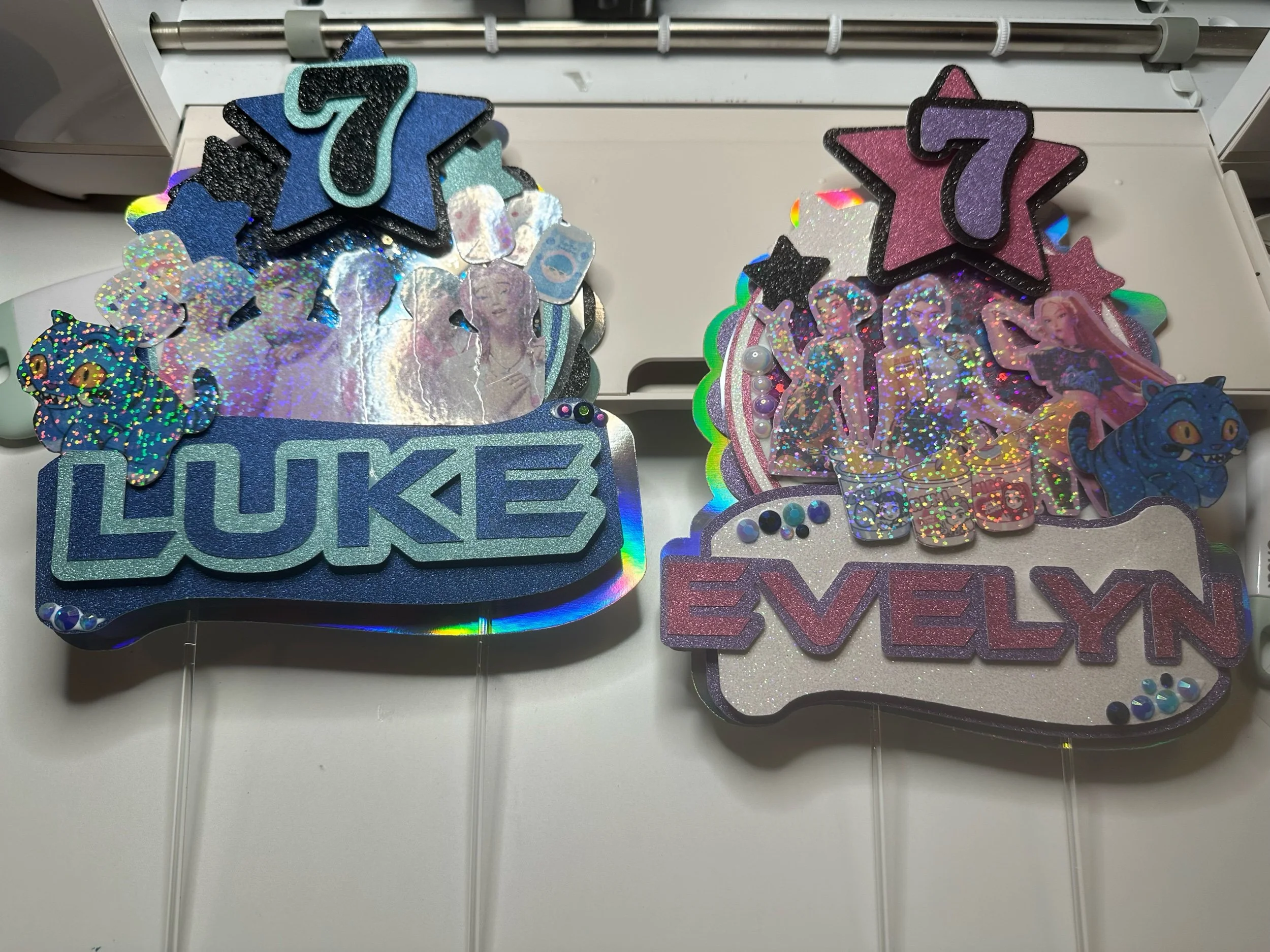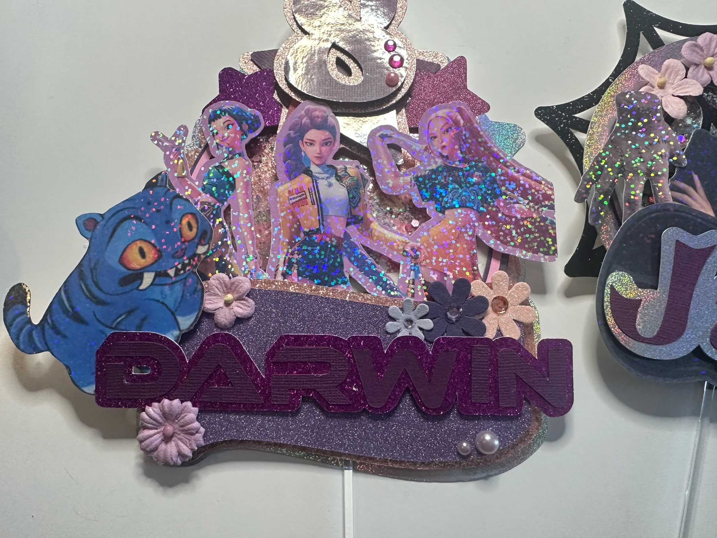 Level up your celebration with this K-Pop Demon Hunter–inspired shaker cake topper! Featuring your favorite characters in a bold, dynamic design, this topper adds sparkle, movement, and major personality to any cake.